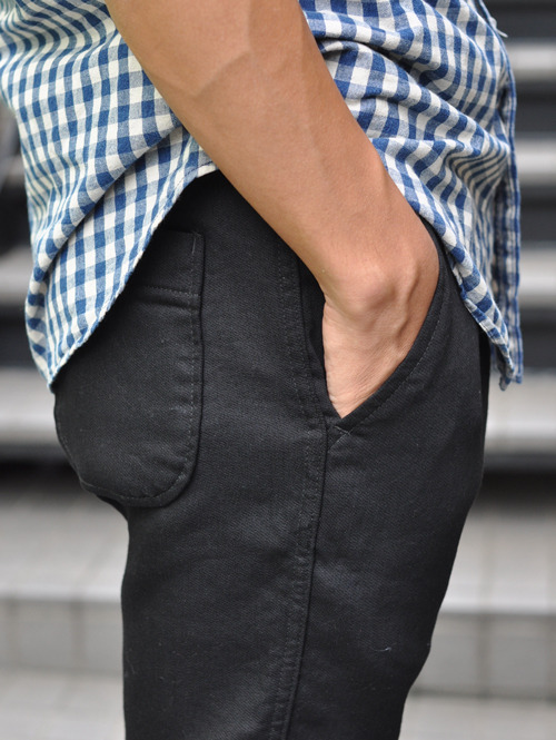 色落ちも良く、伸びたりしないのでこのシルエットのまま穿いていただけます。