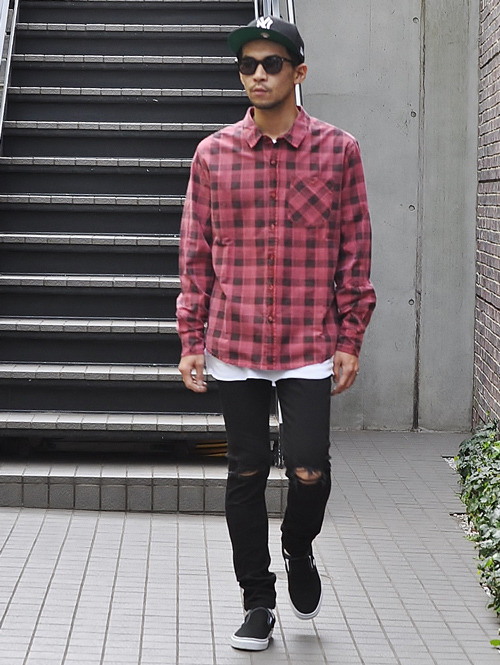 そんなタイトなパンツに少し大きめのトップスを合わせたロックテイスト