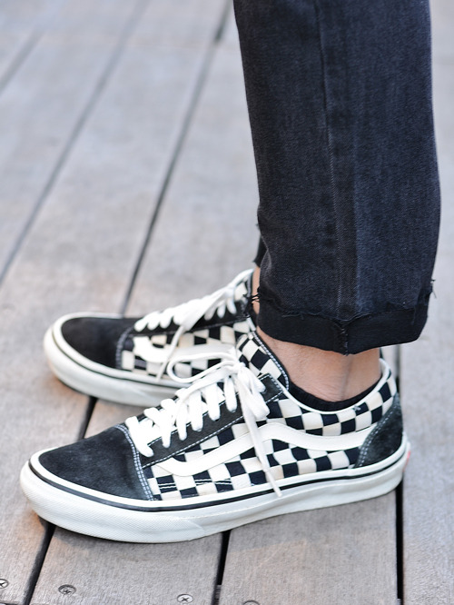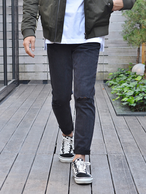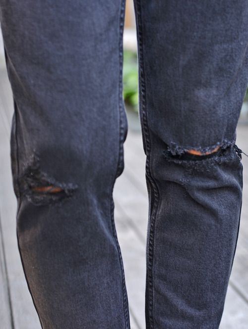 膝にダメージの入ったブラックデニムで