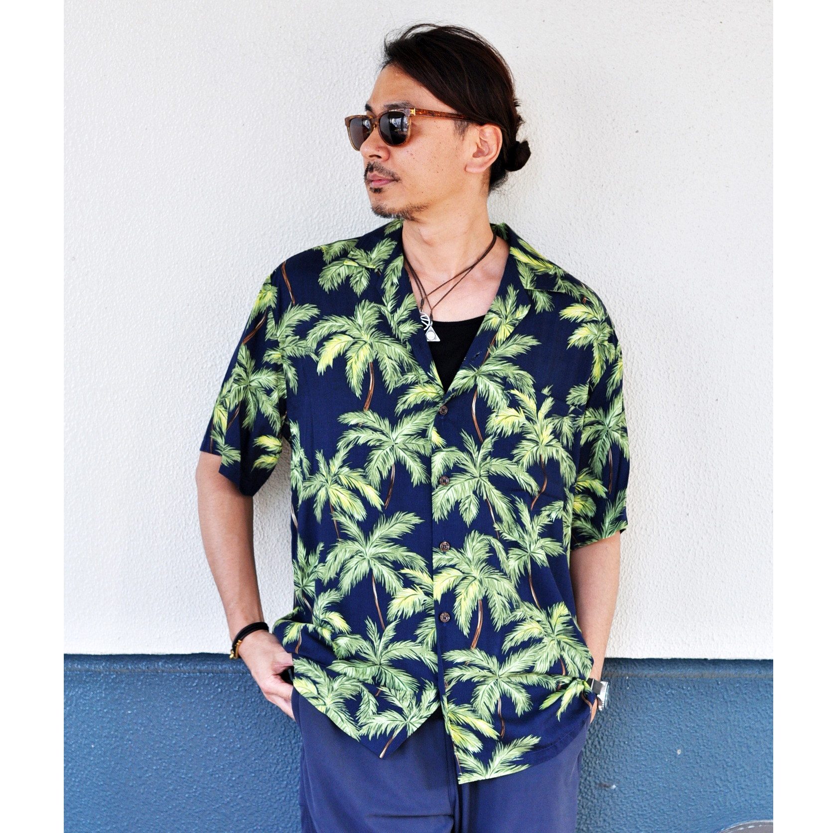 ネイビーのパームツリー柄