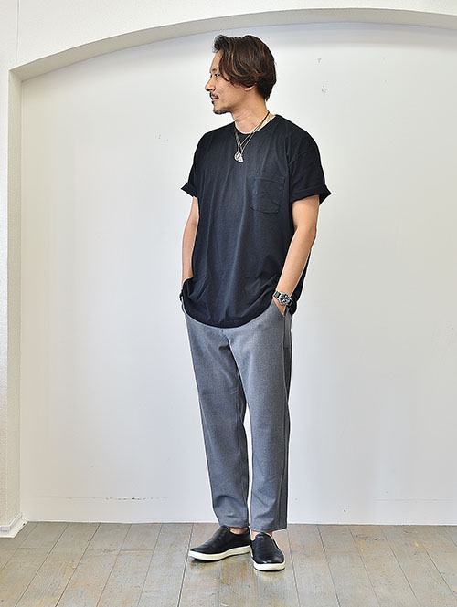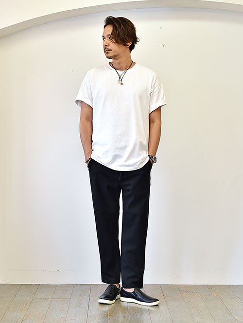 今な感じの太めのパンツで