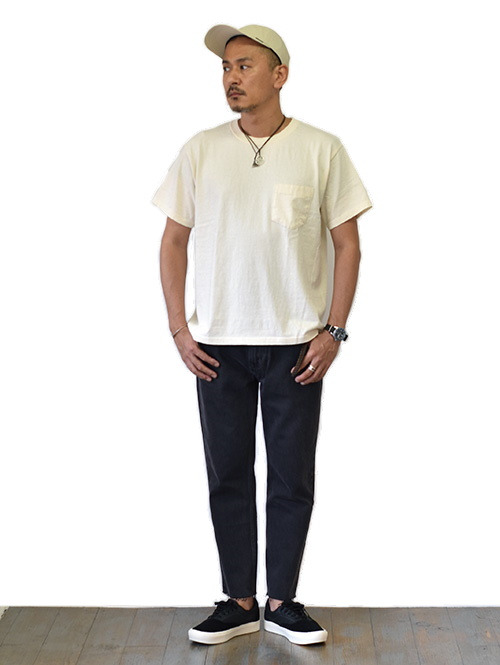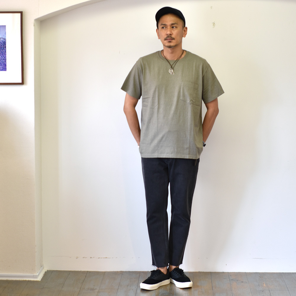 「James Perse]等も使っている日本のファクトリーで、太めの18番手の糸に紡ぎ、丸胴に編み上げて作られたTシャツです。