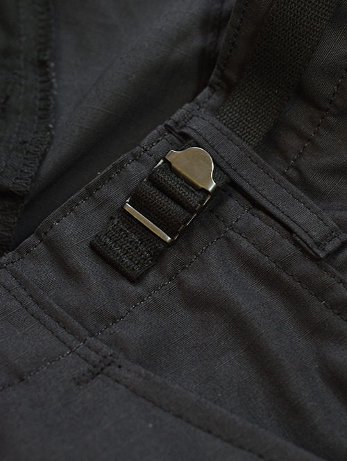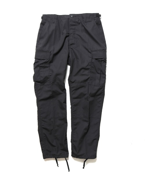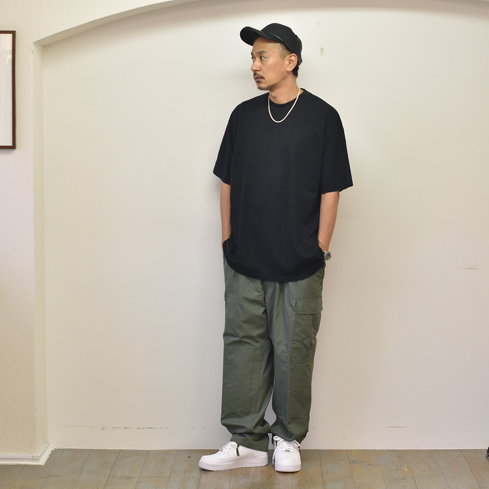 深い股上、ゆとりのあるワタリから裾に向かってテーパードするシルエットのカーゴパンツ