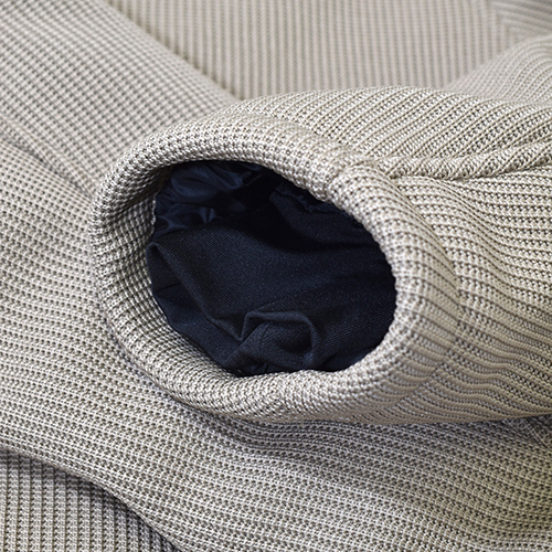 こだわりは表生地で、ニットの様な風合いのポリエステル素材を使っているので
