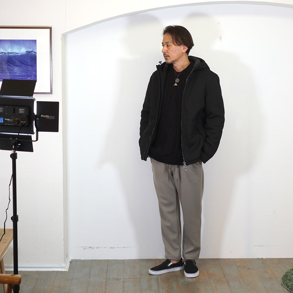 デザインはシンプルなフード付きのショートジャケットなのでスタイリングし易い